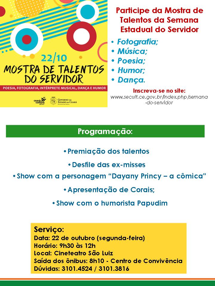 Na segunda-feira (22) pela manhã será realizada em parceria com a Secretaria da Cultura, a Mostra de Talentos no Cineteatro São Luiz. Um júri técnico formado por artistas cearenses irá escolher o melhor talento em cinco categorias: fotografia, música, poesia, humor e dança. No dia da Mostra de Talentos haverá apresentação de corais, desfile das ex-misses e a premiação dos talentos. Todos os servidores/colaboradores do Governo do Estado do Ceará estão convidados para assistir as apresentações no Cineteatro São Luiz. Para isso a Seplag disponibilizará ônibus das rotas saindo do Cambeba às 8h.