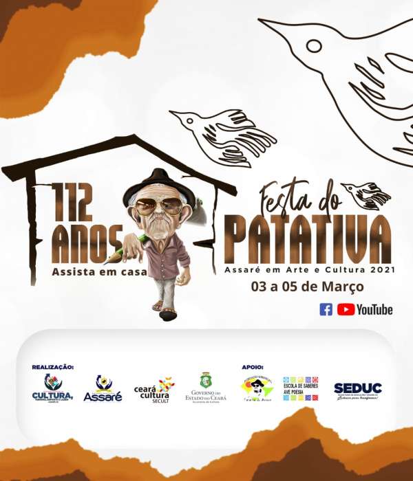 Nos dias 3, 4 e 5 de março de 2021 será realizada de forma virtual a Festa do Patativa do Assaré em Arte e Cultura 2021, em alusão à vida e à obra de nosso poeta maior, Patativa do Assaré, que completaria 112 anos em 2021. Apresentada pelo Governo Municipal e Secretaria de Cultura de Assaré, juntamente com a Secretaria da Cultura do Estado do Ceará do Ceará (Secult), a festa traz uma programação 100% virtual desenvolvida com muito zelo e respeito, de modo a fortalecer as nossas tradições e culturas, mesmo neste momento de pandemia, que nos exige cuidados e distanciamento.