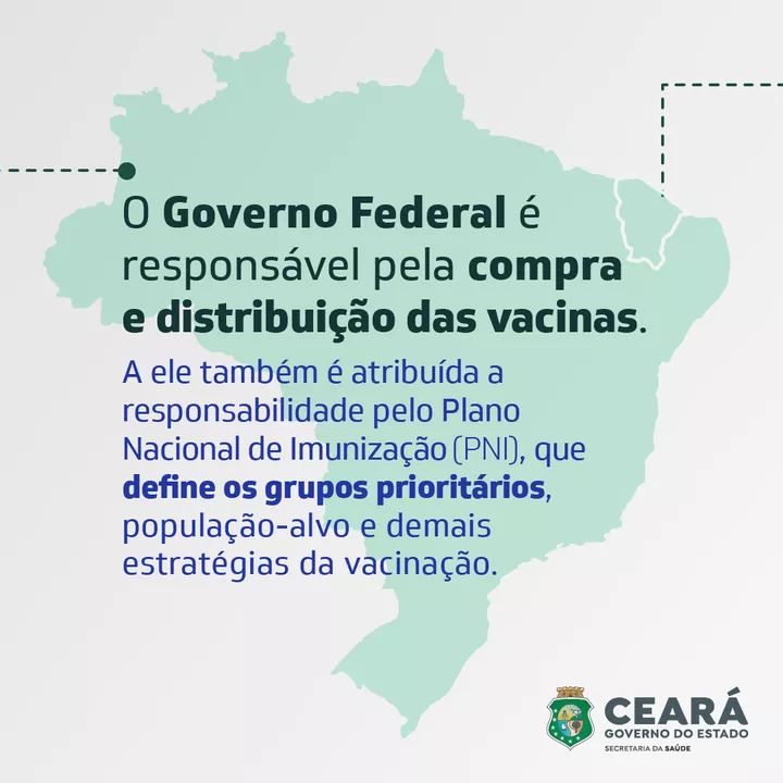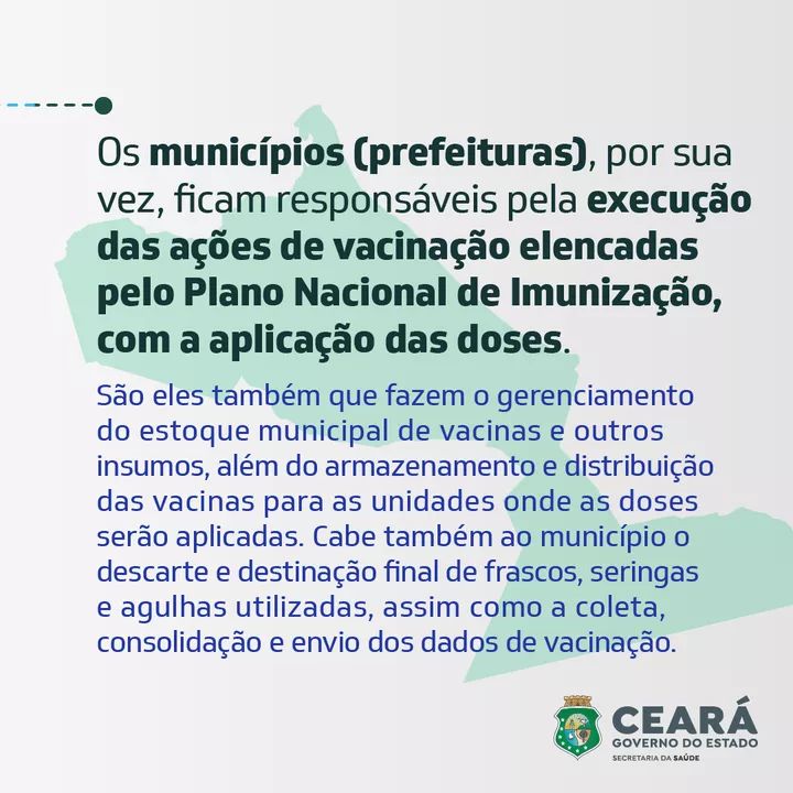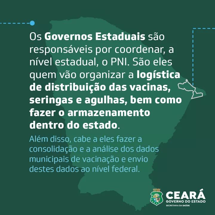 Com as determinações nacionais estabelecidas e os imunizantes em solo cearense, por exemplo, é dever do Governo do Ceará, por meio da Sesa, estabelecer a logística da distribuição das vacinas, seringas e agulhas aos municípios, além do armazenamento prévio dos insumos. O Estado também é encarregado pela consolidação e análise dos dados fornecidos pelas prefeituras e pelo repasse das informações ao Ministério da Saúde (MS).