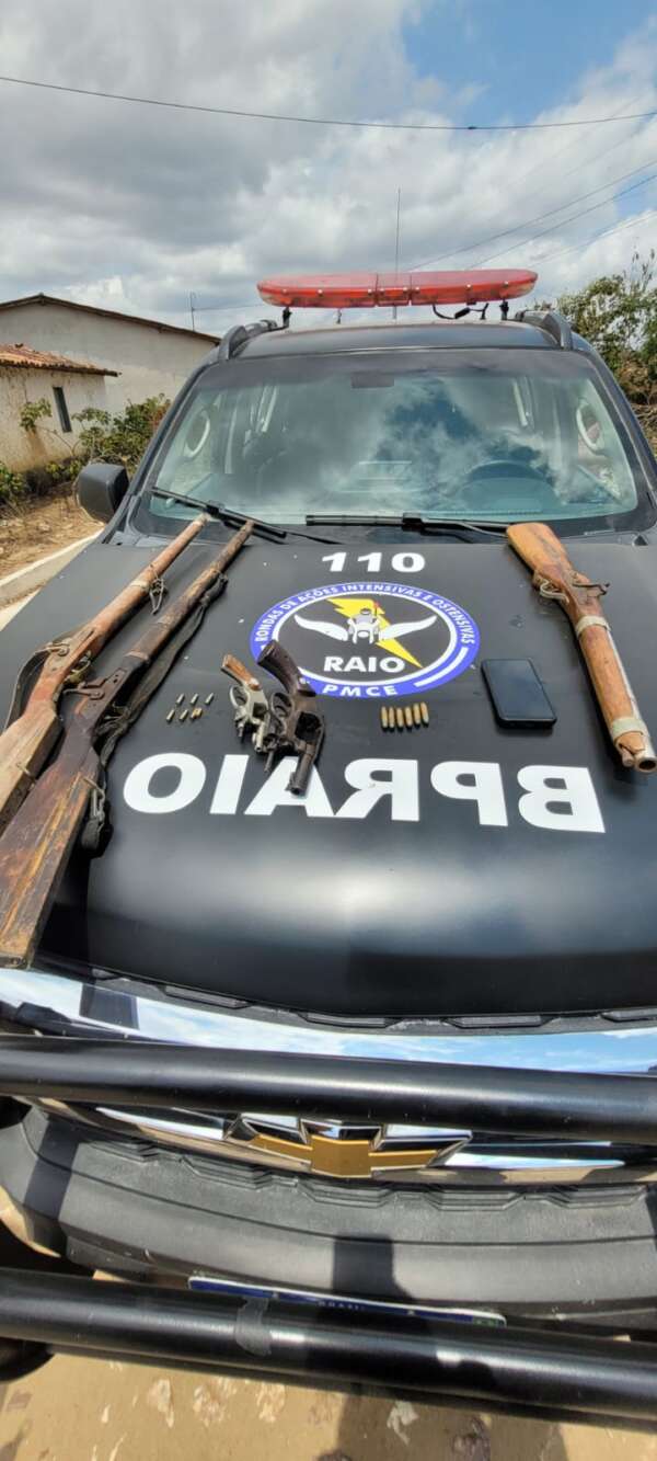 Por volta das 10h30min, a equipe do Comando de Policiamento de Rondas e Ações Intensivas e Ostensivas (CPRaio) da PMCE foi acionada para atender a uma ocorrência de disparos de arma de fogo na localidade de Fazenda Vitória. De imediato, os raianos diligenciaram até o local, onde abordaram João Batista Gomes de Sousa. Após buscas, três espingardas artesanais, dois revólveres calibre 38, além de 13 munições foram apreendidos.