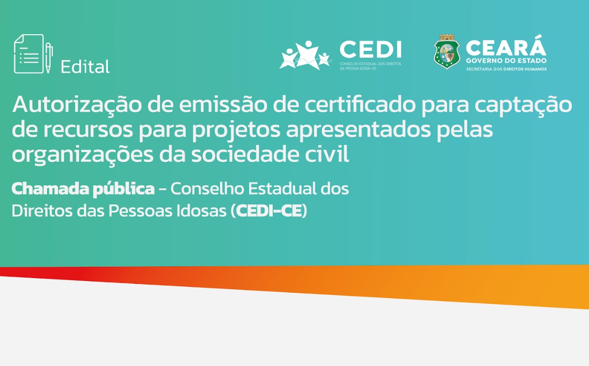 O Conselho Estadual dos Direitos da Pessoa Idosa (CEDI/CE), colegiado vinculado à Secretaria dos Direitos Humanos do Ceará (Sedih), lançou o Edital nº 001/2025, que autoriza a emissão de Certificado de Captação de Recursos (CCR) para projetos de organizações da sociedade civil (OSCs) voltados à promoção e garantia dos direitos da pessoa idosa. As inscrições para a chamada pública podem ser feitas até o dia 1º de junho de 2026.