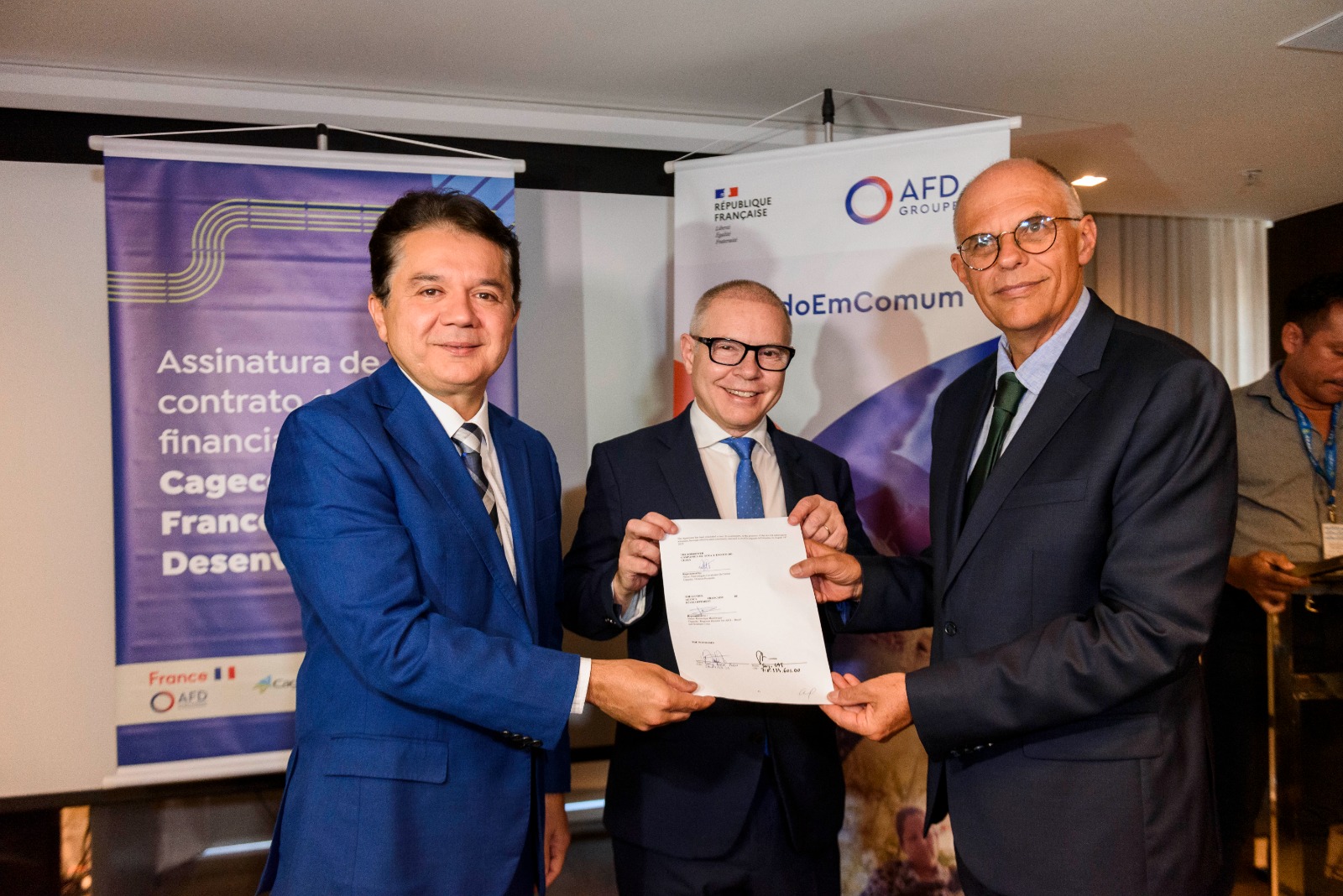A solenidade de assinatura aconteceu no Auditório Walter Nogueira, no BS Design, e contou com a presença do presidente da Cagece, Neuri Freitas, do Cônsul-Geral da França em Recife, Serge Gas, e do diretor regional da AFD no Cone Sul, Dominique Hautbergue.