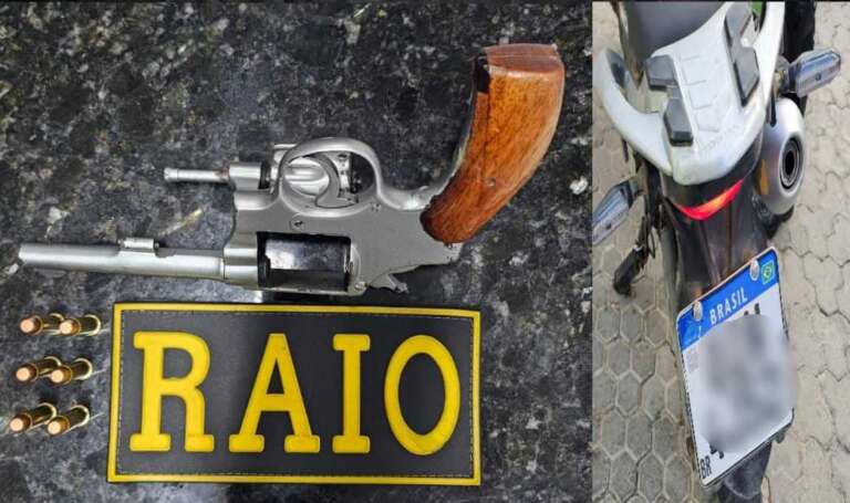 Os policiais patrulhavam as ruas do bairro Terrenos Novos, quando se depararam com dois indivíduos em uma motocicleta trafegando em alta velocidade e desrespeitando os sinais vermelhos. Diante da suspeita, foi realizado o acompanhamento tático e dada a ordem de parada, desrespeitada pelos indivíduos. A abordagem foi realizada e revelou que o garupeiro, um adolescente, carregava consigo um revólver calibre 38, municiado.