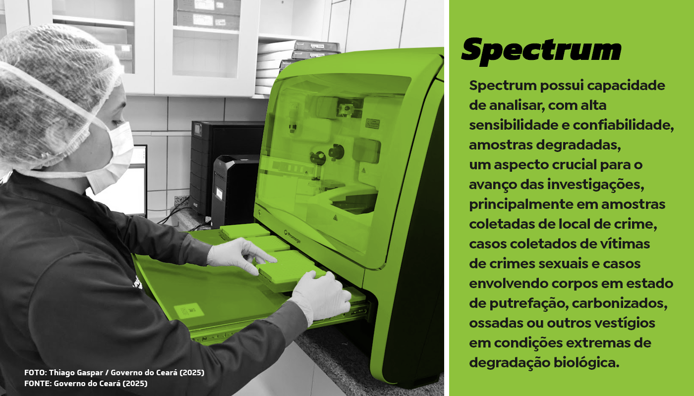 Adquirido por R$ 1 milhão pelo Governo do Ceará, o aparelho é único dentre as mais de 20 instituições estaduais que formam a Rede Integrada de Bancos de Perfis Genéticos (RIBPG). Com um novo sistema permitindo a observação de até 35 marcadores por indivíduo, o Spectrum torna a chance de identificar uma pessoa bem maior e completa. “Já conseguimos identificar pessoas justamente por conta do aumento desse escopo, que não conseguiríamos com o outro método”, completou Natália.