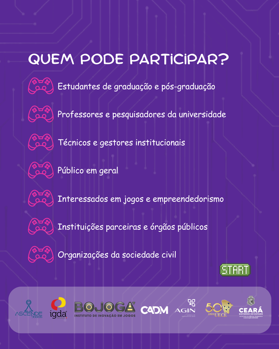 Aberto a estudantes, professores e entusiastas de games, o Ceará Jogos propõe uma manhã de imersão no universo dos jogos digitais, com atividades que vão desde degustações de jogos até apresentações de projetos desenvolvidos por criadores locais.