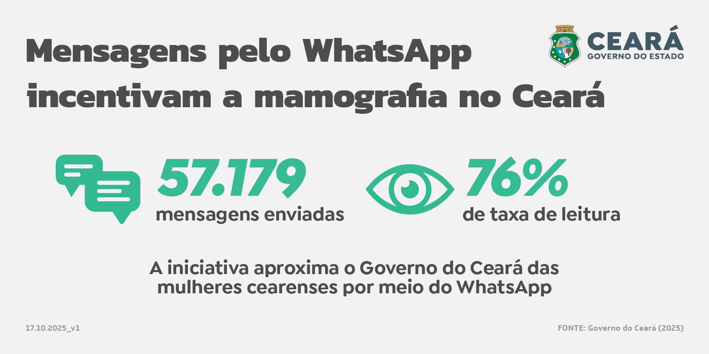 Para alcançar esse resultado, o Governo do Ceará conta com algumas estratégias. Uma delas é o envio de mensagens via aplicativo WhatsApp, direcionadas às mulheres na faixa etária recomendada para o exame, cadastradas nos sistemas da Saúde do Estado. A ação busca incentivar a realização da mamografia, conforme recomenda o Ministério da Saúde.