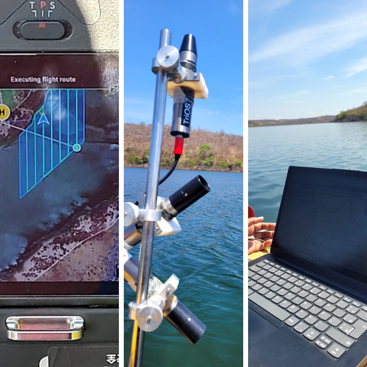 “Foram coletadas amostras na superfície e à profundidade do disco de Secchi, seguindo metodologia da Agência Nacional de Águas. Também utilizamos sondas multiparamétricas e sensores radiométricos para medir parâmetros de campo e dados espectrais”, relata a pesquisadora.