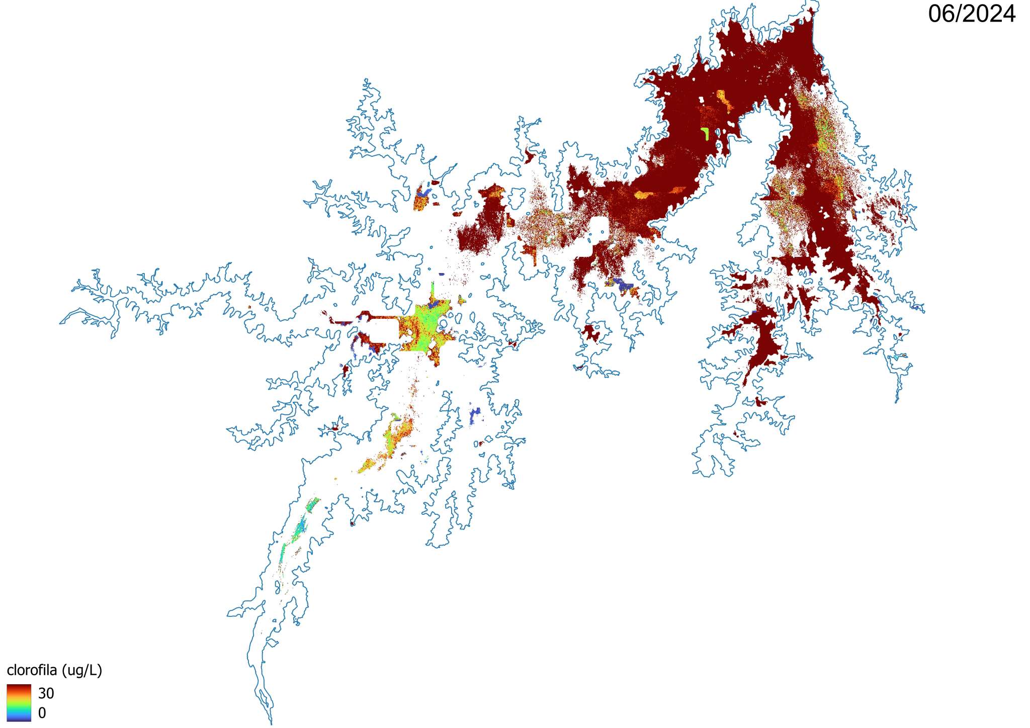 Imagem de satélite do açude Curral Velho, datada de junho de 2024. O reservatório mostrava alta presença de clorofila. (FOTO: Funceme)