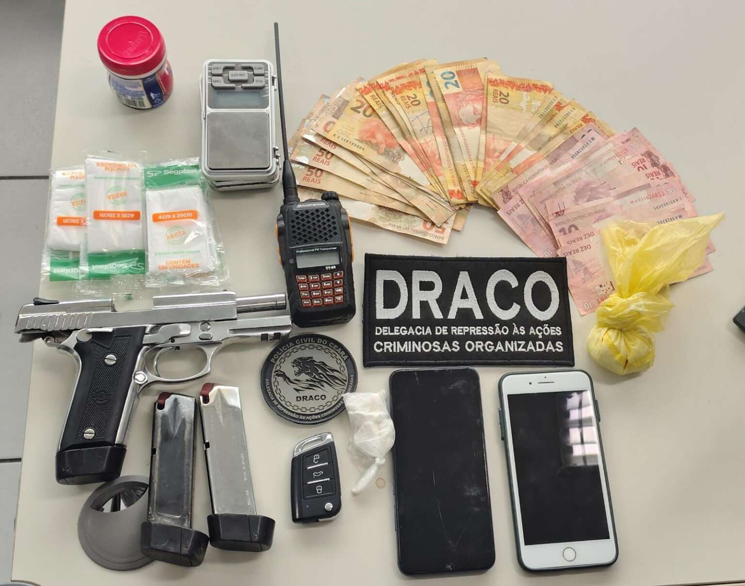 As investigações, conduzidas pela Delegacia de Polícia Civil de Repressão às Ações Criminosas (Draco/PCCE), apontam que os suspeitos atuavam na região do Pecém e na Taíba, ambas na cidade de São Gonçalo do Amarante (AIS 23). Os policiais civis apreenderam na ofensiva: uma arma de fogo, munições, carregador de pistola, drogas, celulares e um automóvel. A operação ainda contou com o apoio do Departamento de Inteligência Policial (DIP/PCCE) e da Polícia Militar do Ceará (PMCE).