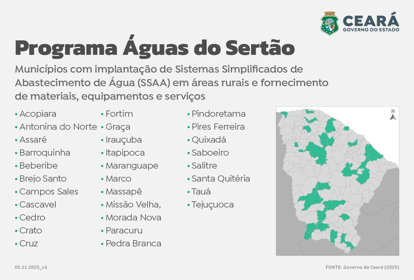 Parte estratégica da política de saneamento básico do Governo do Ceará voltada às localidades rurais, o Programa Águas do Sertão (PAS) vai contar com R$ 161 milhões em investimentos para reduzir a vulnerabilidade e fortalecer a resiliência da população frente às secas e à escassez hídrica.