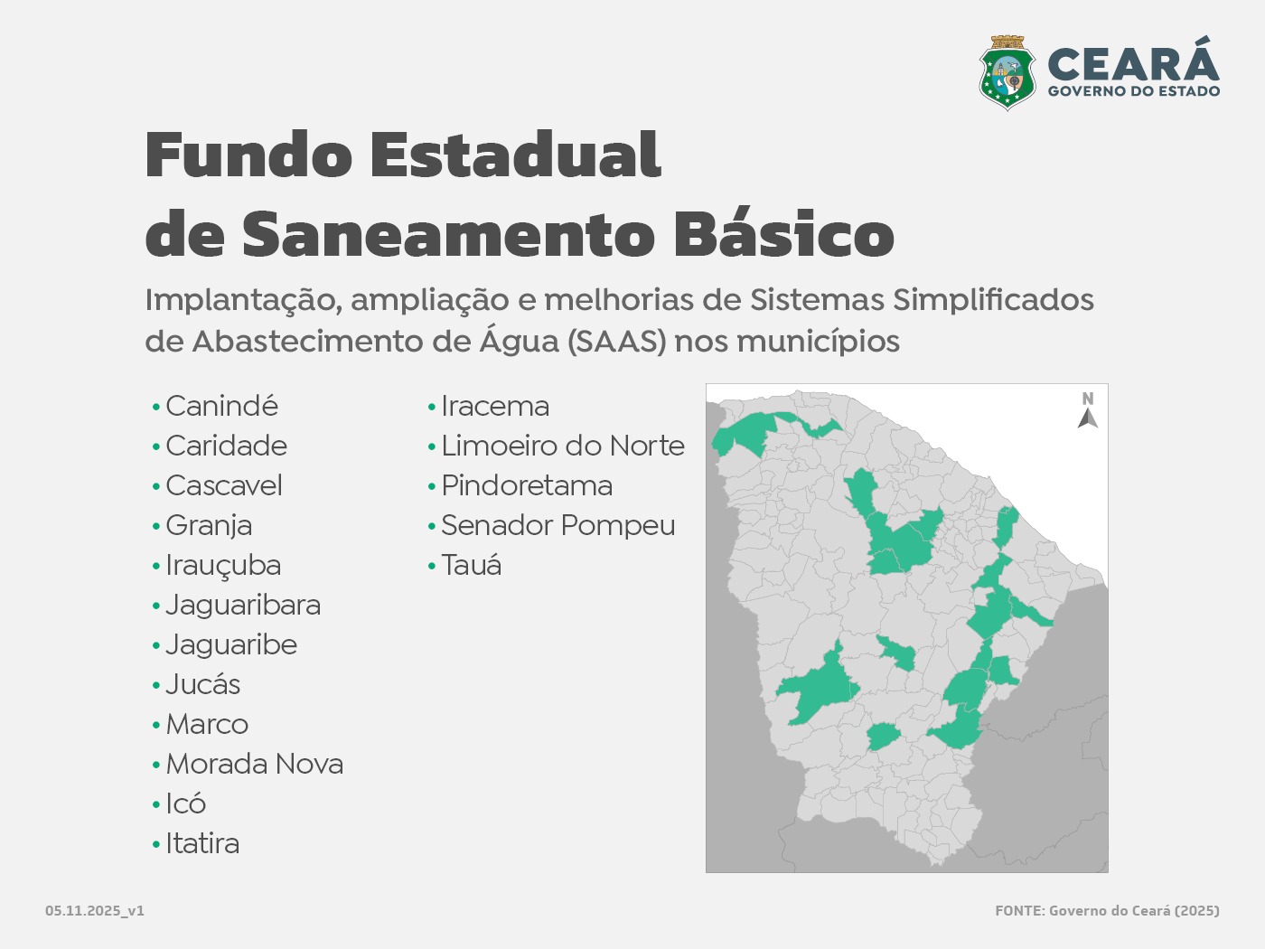 Na mesma cerimônia, também foram anunciados R$ 26 milhões em recursos para a implantação e melhoria de Sistemas de Abastecimento de Água (SAA), com a construção de 18 sistemas em 17 municípios. Vinculado à SCidades, o Fundo Estadual de Saneamento Básico (FESB) tem como missão ampliar o acesso da população, urbana e rural, à água limpa e ao saneamento básico. Para isso, utiliza ferramentas financeiras e de gestão próprias, garantindo que mais cearenses tenham acesso a serviços essenciais e de qualidade.