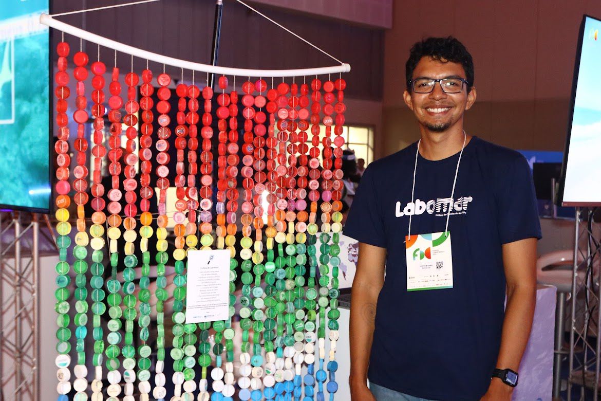 Apaixonado pelos oceanos e pelo meio ambiente, o expositor Lúcio Brabo, do Instituto de Ciências do Mar da Universidade Federal do Ceará (UFC), apresentou na FdC o projeto Cortina de Correntes, integrante da iniciativa Detetives dos Plásticos, que evidencia como tampas plásticas descartadas em mares distantes chegam ao litoral do Ceará, trazidas pelas correntes oceânicas.