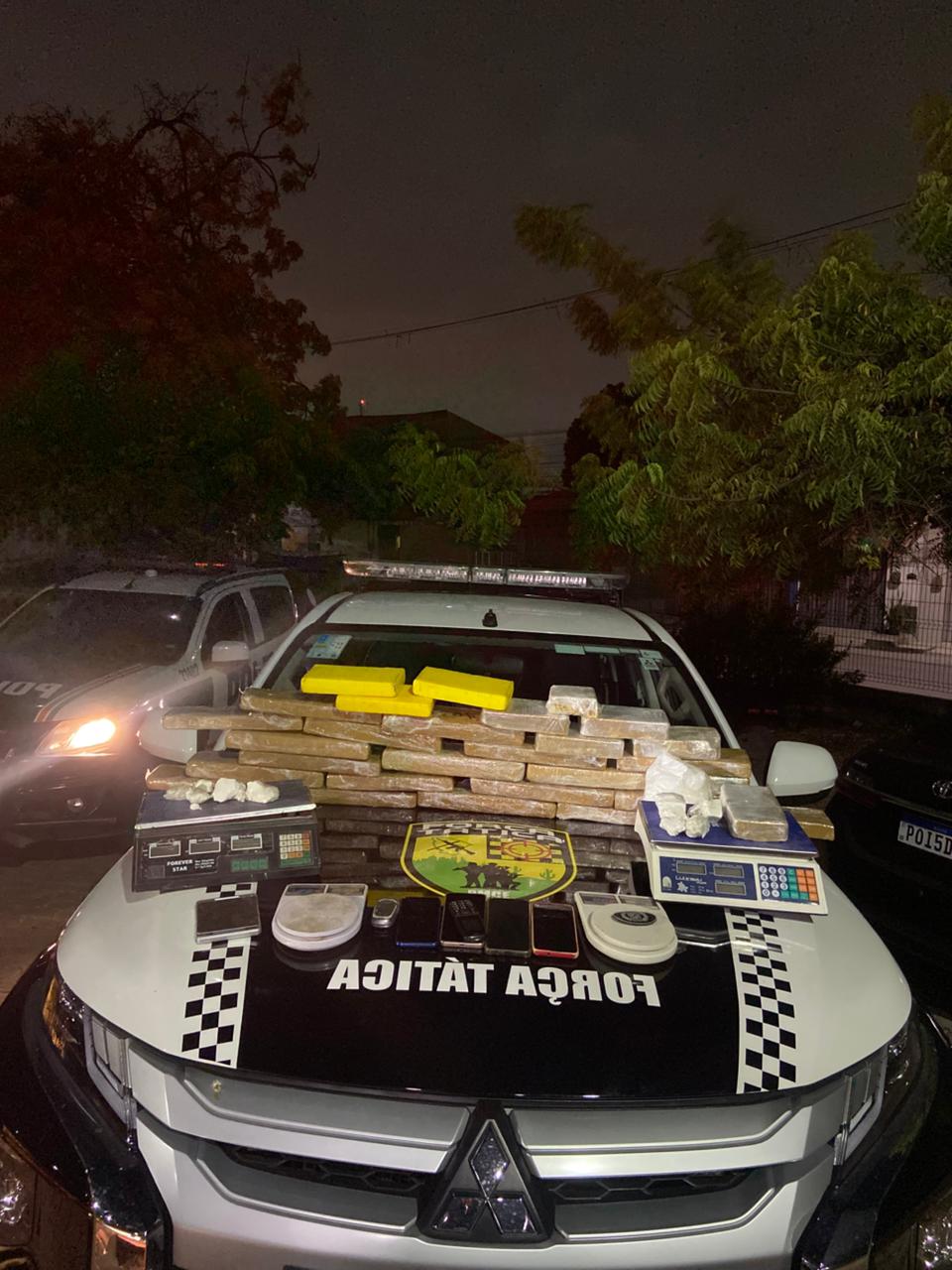 Durante a abordagem, foram localizados, em um imóvel abandonado nas proximidades, 19 tabletes de maconha (19,34 kg), quatro tabletes de cocaína (4,5 kg), seis tabletes de crack (6 kg), balanças de precisão e industriais, sacos plásticos, celulares e cinco granadas. A área foi isolada, e o Esquadrão Antibombas do Batalhão de Operações Policiais Especiais (Bope) da PMCE, foi acionado para o recolhimento e posterior detonação, em segurança.