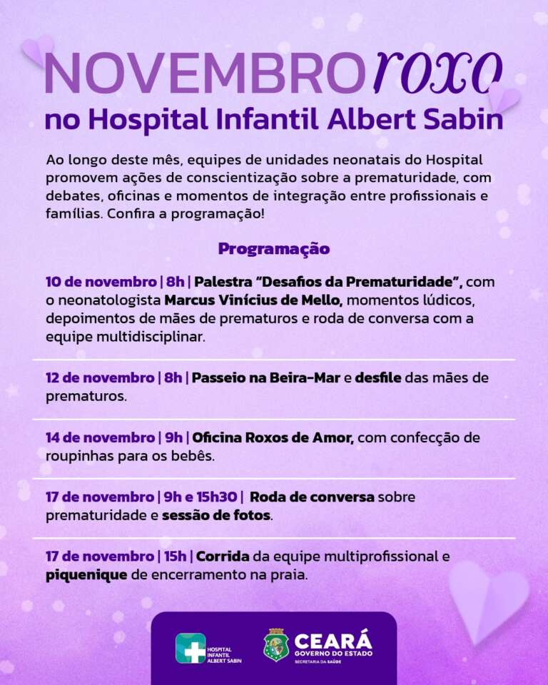 O caso de Asafe é um entre muitos que passam pelas unidades neonatais do Hias, referência no atendimento a recém-nascidos prematuros e cirúrgicos no Ceará. Em alusão ao Novembro Roxo, período dedicado à conscientização e prevenção da prematuridade, a unidade realiza ao longo deste mês uma programação dedicada à conscientização da prematuridade. A iniciativa promove debates, oficinas e momentos de integração entre profissionais e famílias.