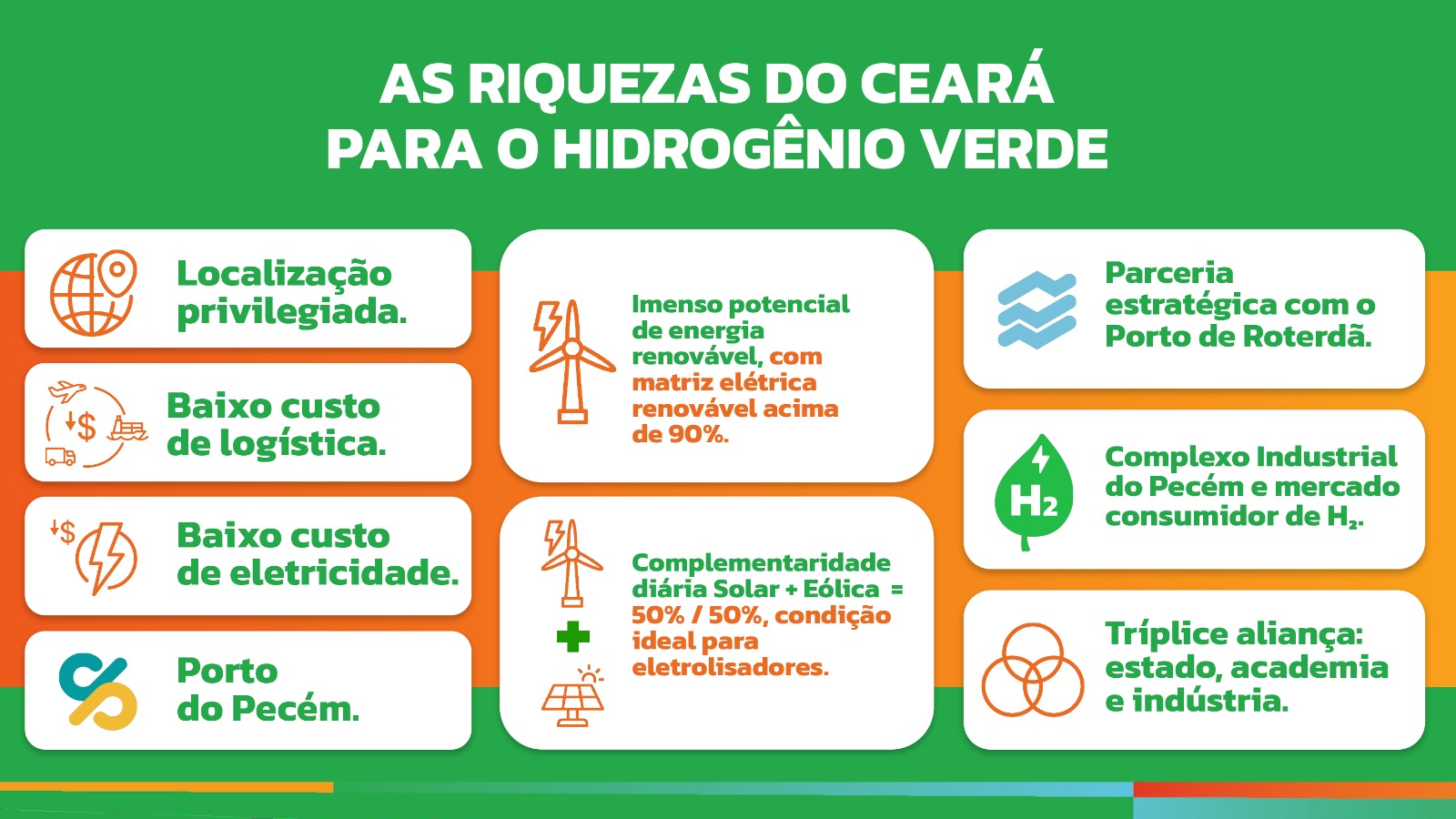Durante sua fala, o governador Elmano de Freitas também apresentou o potencial do Ceará na agenda do Hidrogênio Verde (H2V), destacando nove pontos estratégicos que evidenciam os benefícios do estado, desde sua localização privilegiada até as parcerias consolidadas e a infraestrutura logística.