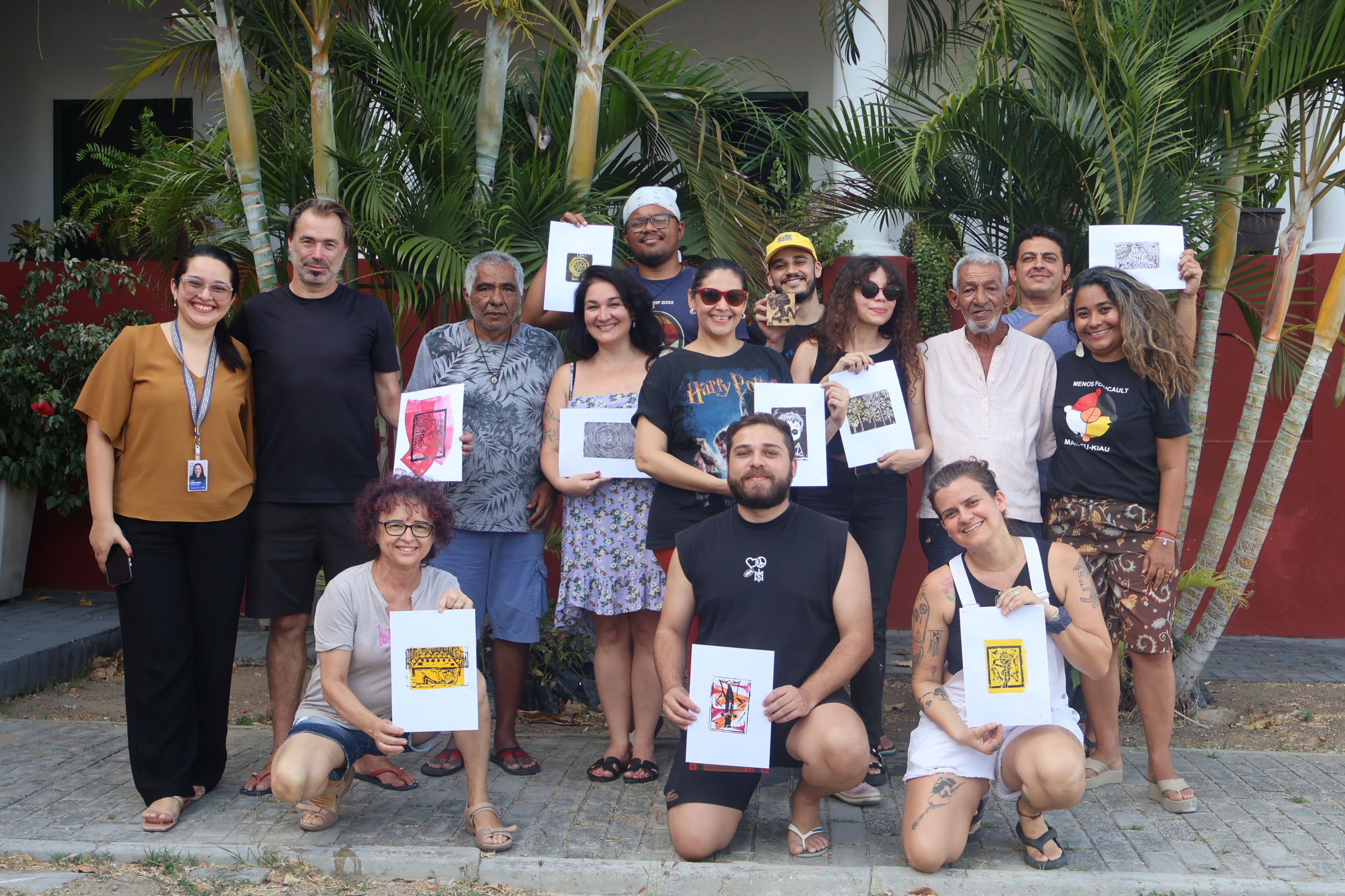Na segunda sala, os visitantes encontrará os resultados da Oficina de Xilogravura realizada em Quixadá, conduzida pelo próprio mestre. As peças produzidas pelos participantes evidenciam o alcance formativo da ação e reforçam o papel do Mestre Stênio na transmissão de técnicas e saberes, fortalecendo a continuidade de uma tradição que segue viva e em constante transformação.
