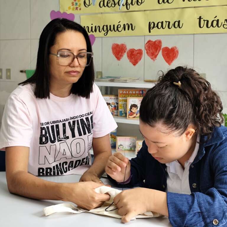 Na Escola de Ensino Médio (EEM) Ubirajara Índio do Ceará, também em Fortaleza, os alunos acolhidos pelo Atendimento Educacional Especializado (AEE) encontram na arte uma forma de expressar sentimentos, promover regulação emocional e desenvolver novas habilidades. O serviço, que se caracteriza por prestar apoio complementar ou suplementar para alunos com deficiência, transtorno do espectro autista (TEA) e altas habilidades/superdotação, incluiu a prática de bordado, pintura, crochê e desenho entre as atividades ofertadas. Apenas no bordado, há atualmente 13 alunos participando.