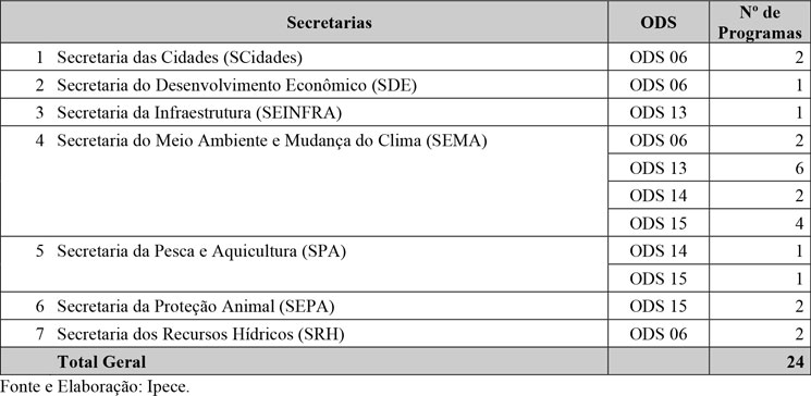 Das sete secretarias e órgãos da administração pública estadual, Quatro secretarias tiveram programas alinhadas com o ODS 6 – Água potável e saneamento; três secretarias tiveram programas alinhadas com o ODS 13 – Ação contra a mudança global do clima; duas secretarias tiveram programas alinhadas com o ODS 14 – Vida na Água e três secretarias tiveram programas alinhadas com o ODS 15 – Vida Terrestre. Vale ressaltar que algumas delas possuem mais de um programa, bem como atende a mais de um ODS, como é demonstrado no quadro abaixo.