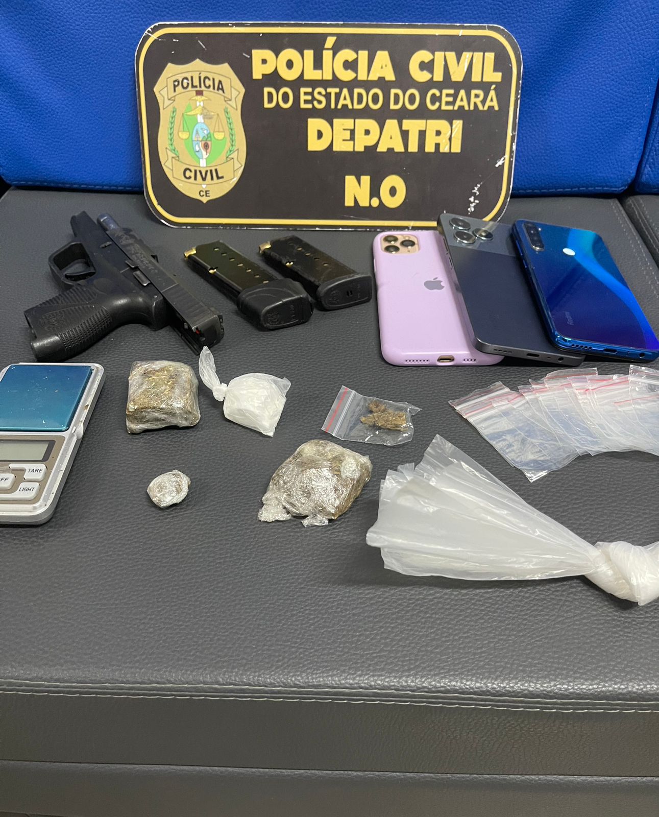 O homem, de 19 anos, foi autuado por receptação. Já a mulher, de 26 anos, foi autuada por tráfico ilícito de drogas e posse ilegal de arma de fogo. Durante as diligências, os policiais civis visualizaram a mulher tentando se desfazer de uma bolsa que continha drogas, uma balança de precisão, uma arma de fogo e carregadores. Com o aprofundamento das investigações, as equipes também identificaram que um homem estava em posse de um aparelho celular roubado.