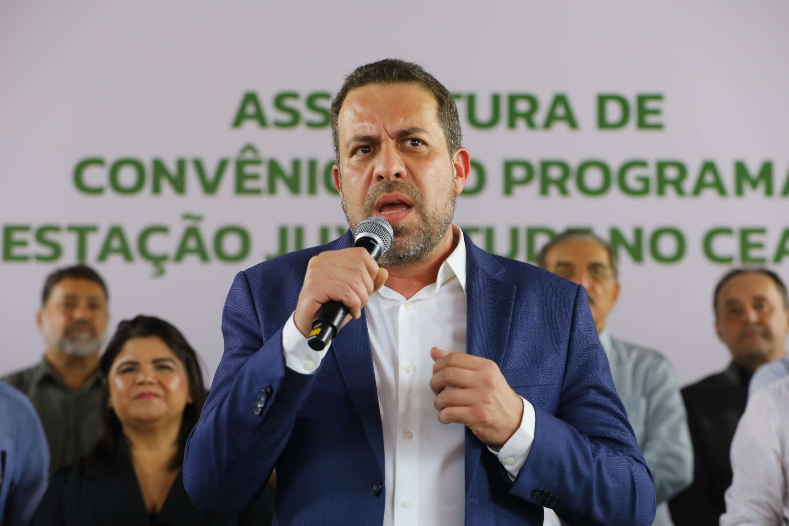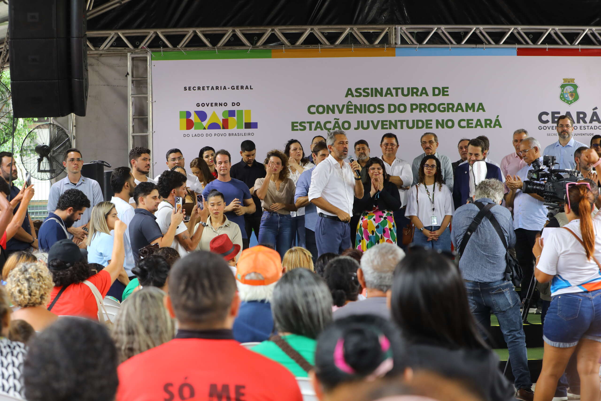 O governador Elmano de Freitas comemorou, nesta segunda-feira (22), a entrada de quatro municípios cearenses no Programa Estação Juventude, do Governo Federal. Fortaleza, Horizonte, Tauá e Barbalha vão receber R$ 500 mil cada para fomentar políticas para jovens, entre 15 e 29 anos, com cursos, esporte e cultura. O evento, que aconteceu no bairro Messejana, na Capital, também contou com a presença do ministro da Secretaria-Geral da Presidência, Guilherme Boulos; além de outras autoridades.