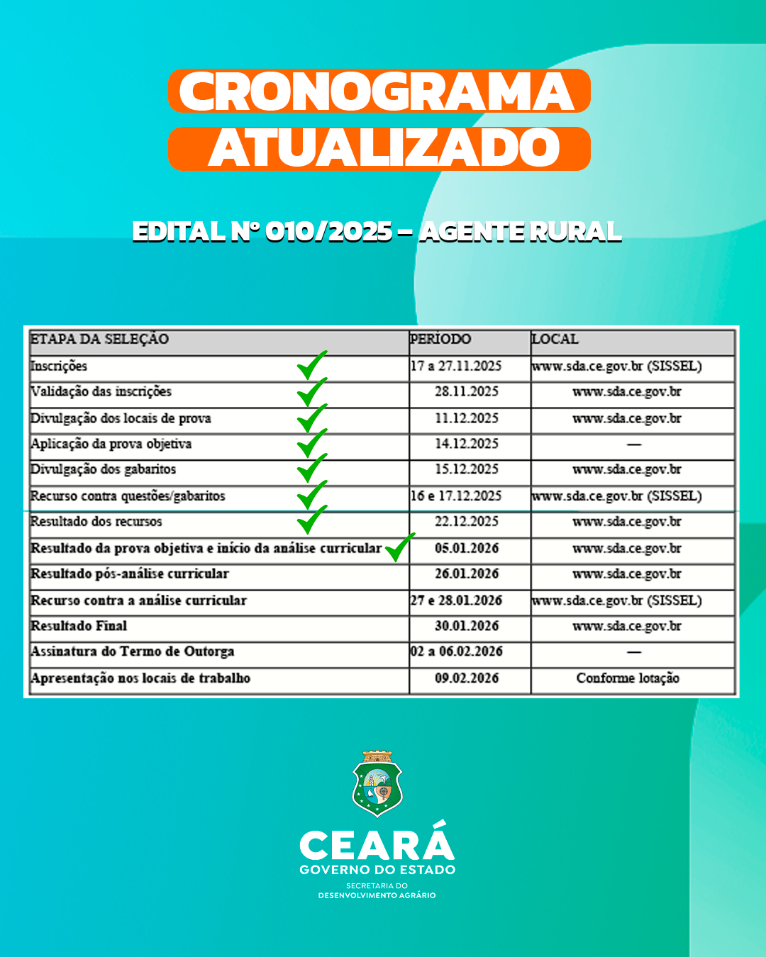 A Secretaria do Desenvolvimento Agrário do Ceará (SDA) divulga o cronograma oficial do Processo Seletivo para o Programa Agente Rural, referente ao Edital nº 010/2025. O certame trata da concessão de bolsas de extensão rural no âmbito do programa desenvolvido pelo Governo do Estado.