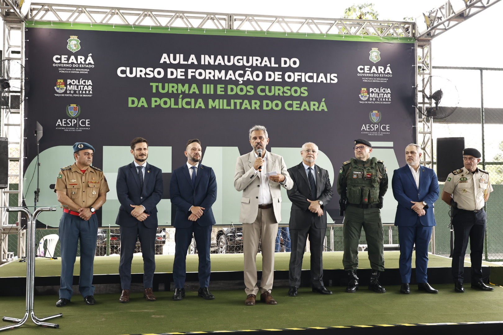 Mais um passo foi dado no caminho de fortalecimento da Polícia Militar do Ceará (PMCE). O governador Elmano de Freitas participou, nesta quarta-feira (21), da aula inaugural do Curso de Formação para 80 novos oficiais da PMCE. Na ocasião, também teve início o Curso Superior de Segurança Pública (CSSP) da PMCE.