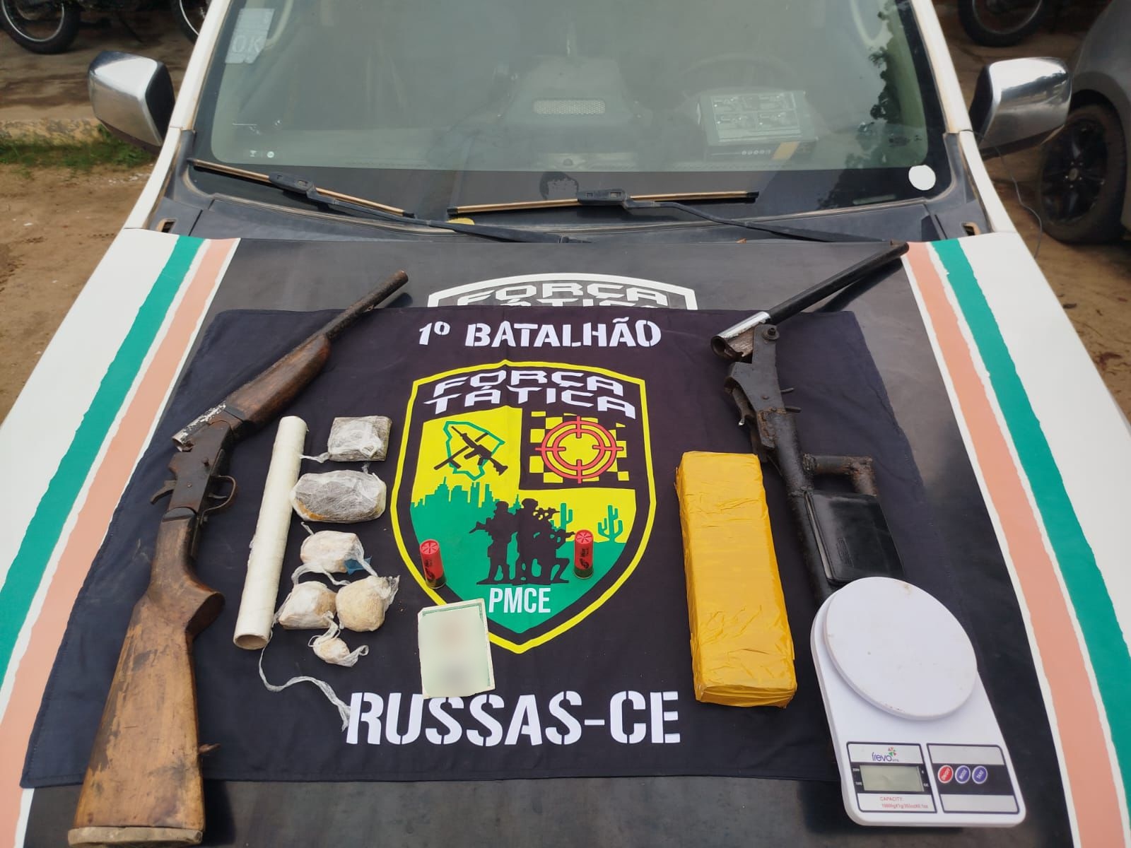 Uma equipe da 1ª Companhia do 1º Batalhão da Polícia Militar do Ceará (PMCE) apreendeu armas, drogas e munições, nessa terça-feira (27), no bairro Várzea Alegre, no município de Russas – Área Integrada de Segurança 1 (AIS 1) do estado.