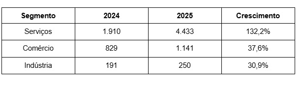 A expansão foi puxada principalmente pelo setor de serviços, que apresentou o maior avanço proporcional. Em 2024, o segmento registrou 1.910 novos negócios, número que saltou para 4.433 em 2025, representando um crescimento de 132,2%.