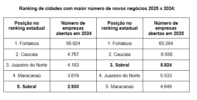 O desempenho positivo refletiu diretamente no posicionamento do município no ranking estadual. A Princesa do Norte escalou duas posições na lista de cidades com maior número de novas empresas, saindo do 5º lugar para ocupar o 3º posto, ultrapassando pólos importantes como Juazeiro do Norte e Maracanaú.