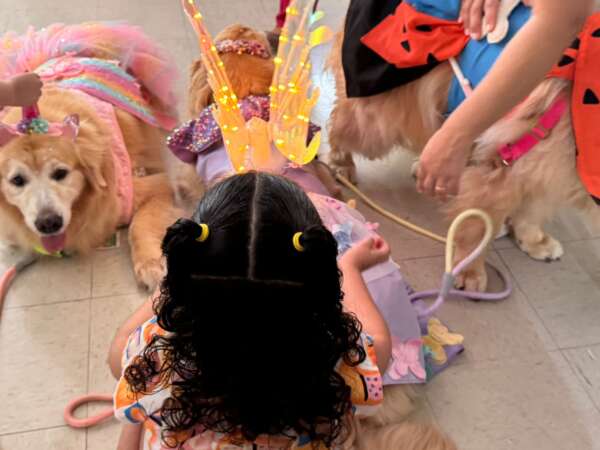 Vestidas com adereços alegres e temáticos, muitos lembrando as cores e a folia da festa, as cachorrinhas da raça golden retriever circularam pelos corredores da Pediatria, convidando as crianças a interagir e fazer fotos.