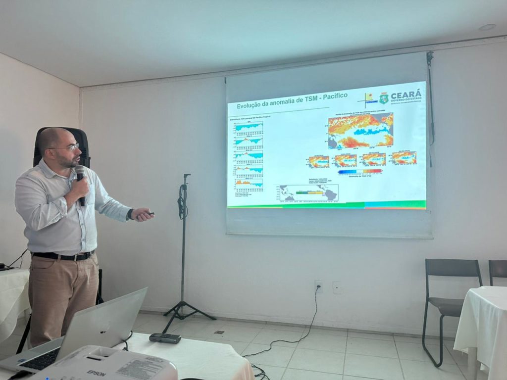 A programação contou ainda com apresentação do prognóstico climático para os próximos dias e perspectivas para a quadra chuvosa no Ceará, conduzida por Francisco Júnior, diretor técnico da Funceme.