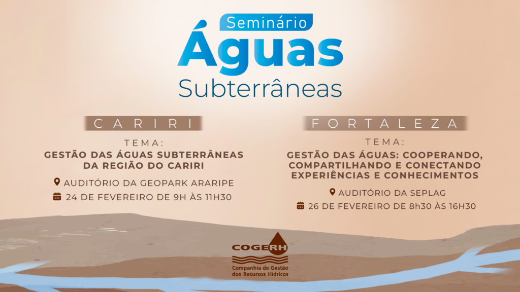 A Companhia de Gestão dos Recursos Hídricos (Cogerh) realiza, nos dias 24 e 26 de fevereiro, dois seminários voltados ao fortalecimento da gestão das águas subterrâneas no Ceará. Os encontros acontecerão no Cariri e em Fortaleza e vão apresentar resultados obtidos a partir de convênio firmado entre a Cogerh e a Universidade Estadual Paulista (Unesp).