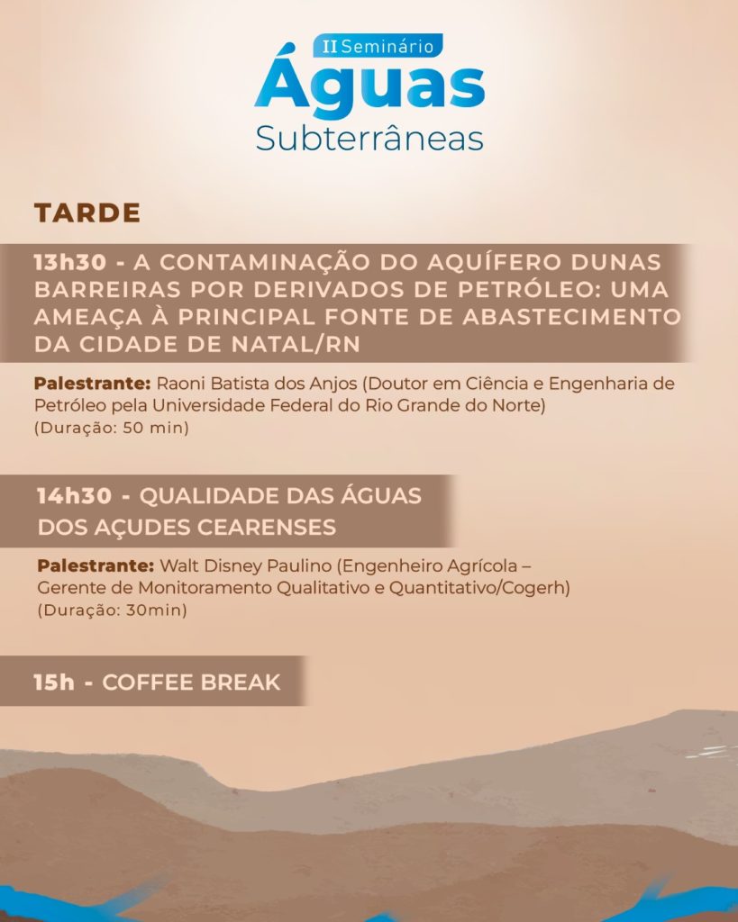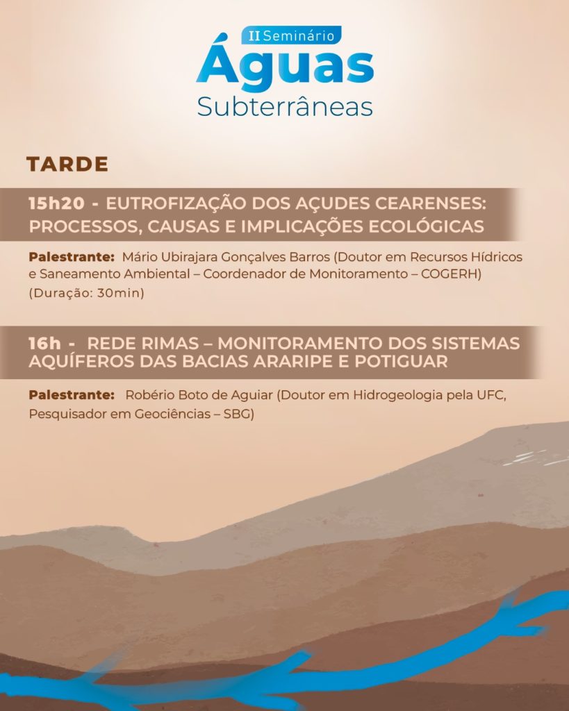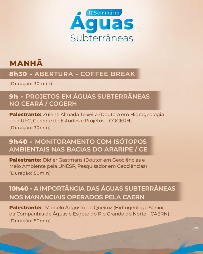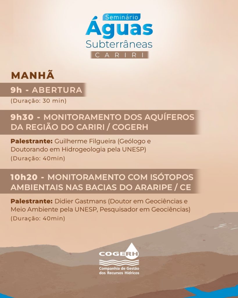 No dia 24 de fevereiro, das 9h às 11h30, o seminário será realizado no Auditório do Geopark Araripe, no Crato, com o tema “Gestão das Águas Subterrâneas da Região do Cariri”. Veja a programação completa: