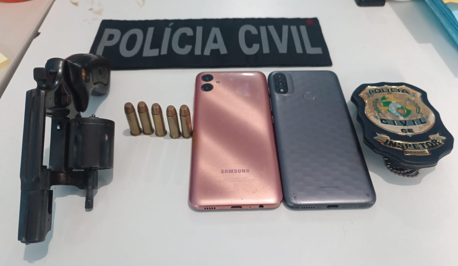 No momento da abordagem, os policiais encontraram com o suspeito um revólver calibre .38 e munições do mesmo calibre. O homem já possui antecedentes criminais por tráfico de drogas, crime contra a administração pública e posse ilegal de arma de fogo. Diante disso, ele foi conduzido à unidade policial, onde o mandado de prisão preventiva foi cumprido. Ele também foi autuado em flagrante pelo crime de posse irregular de arma de fogo com numeração suprimida. A PCCE segue com as investigações, tendo em vista indícios da participação do investigado em outro homicídio registrado no último dia 12 deste mês, também no município de Parambu.