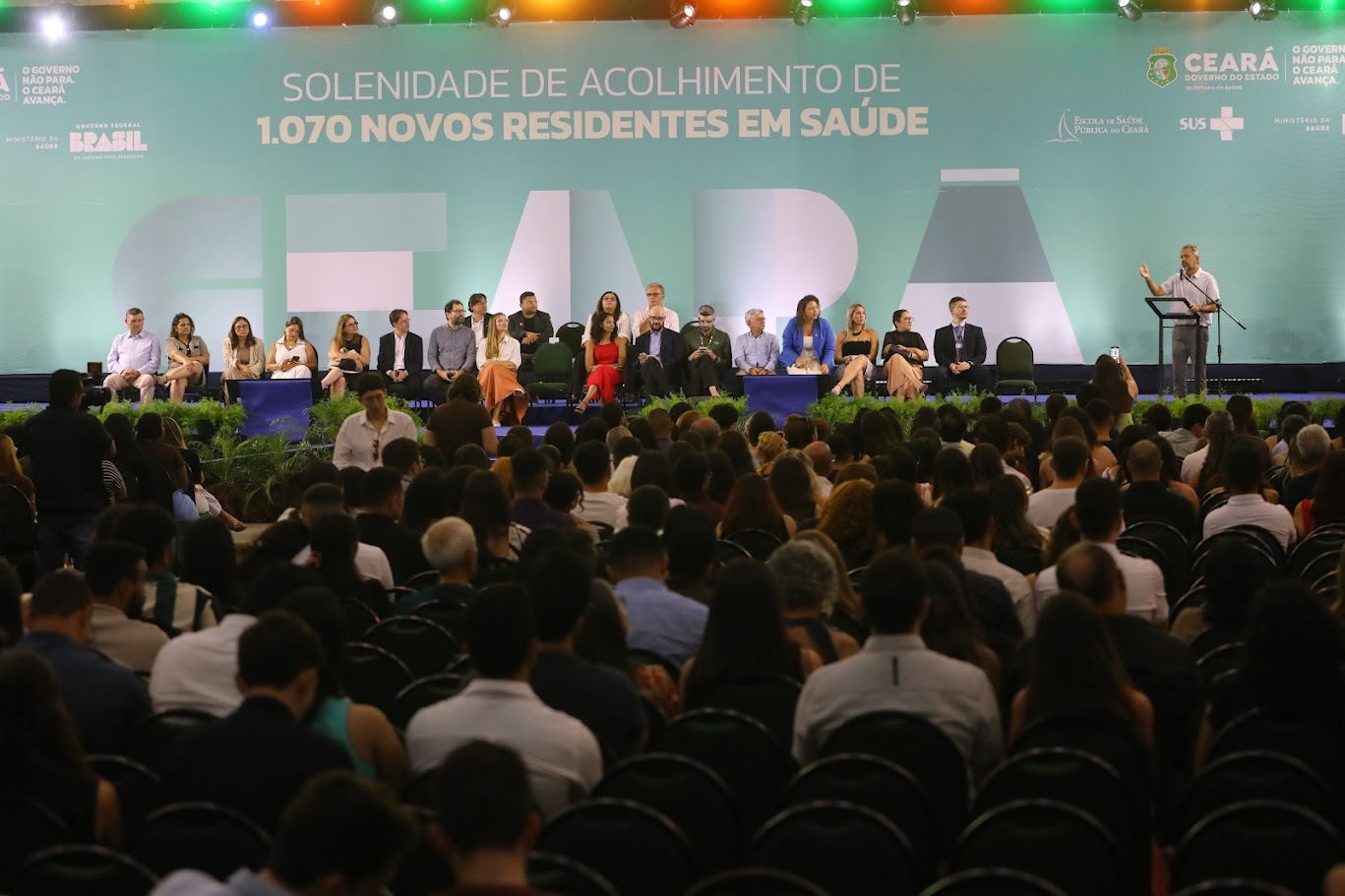 A saúde pública do Ceará avança com os 1.073 profissionais que ingressaram nesta sexta-feira (27) nas Residências em Saúde, iniciativa coordenada pela Secretaria da Saúde do Ceará (Sesa), por meio da Escola de Saúde Pública Paulo Marcelo Martins Rodrigues (ESP/CE). A solenidade de acolhimento foi realizada no Centro de Eventos do Ceará, em Fortaleza, com a presença do governador Elmano de Freitas, acompanhado de outras autoridades.