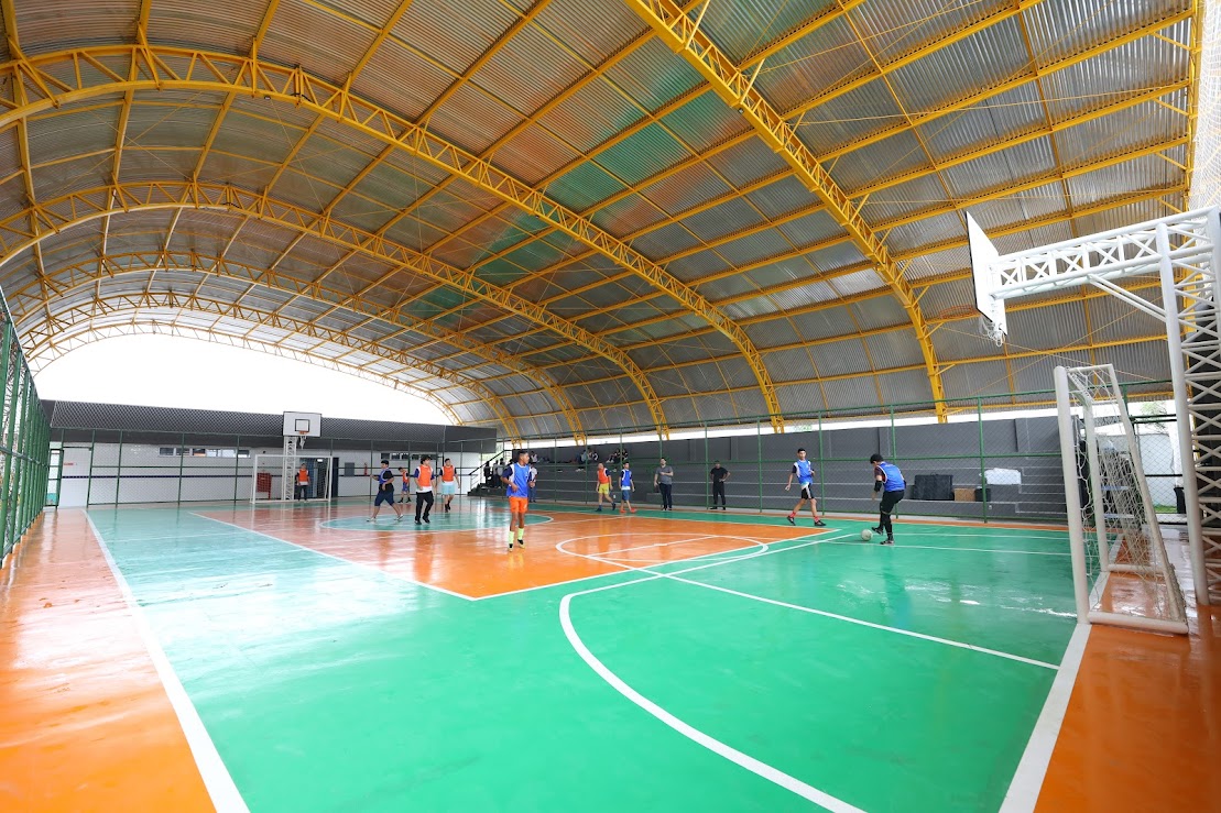 No primeiro pavimento, estão os laboratórios de informática e de ciências, além de salas de aula e espaços de apoio. Já no segundo pavimento, há mais salas de aula, direção, sanitários, quadra poliesportiva e pátios cobertos.