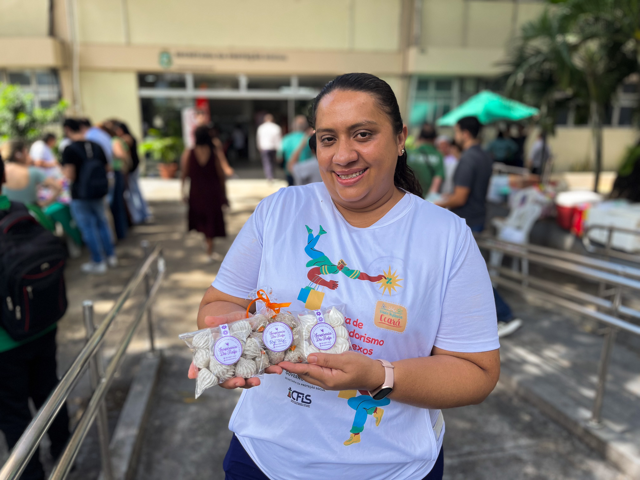 Entre os expositores estava a empreendedora Rafaela Monteiro, de 34 anos, que encontrou na produção de suspiros uma oportunidade de renda e também de realização pessoal. A história começou de forma simples, quando ela procurava laços para a filha e decidiu aprender a produzi-los por conta própria. Mais tarde, a busca por suspiros para o aniversário da menina acabou abrindo caminho para um novo negócio.