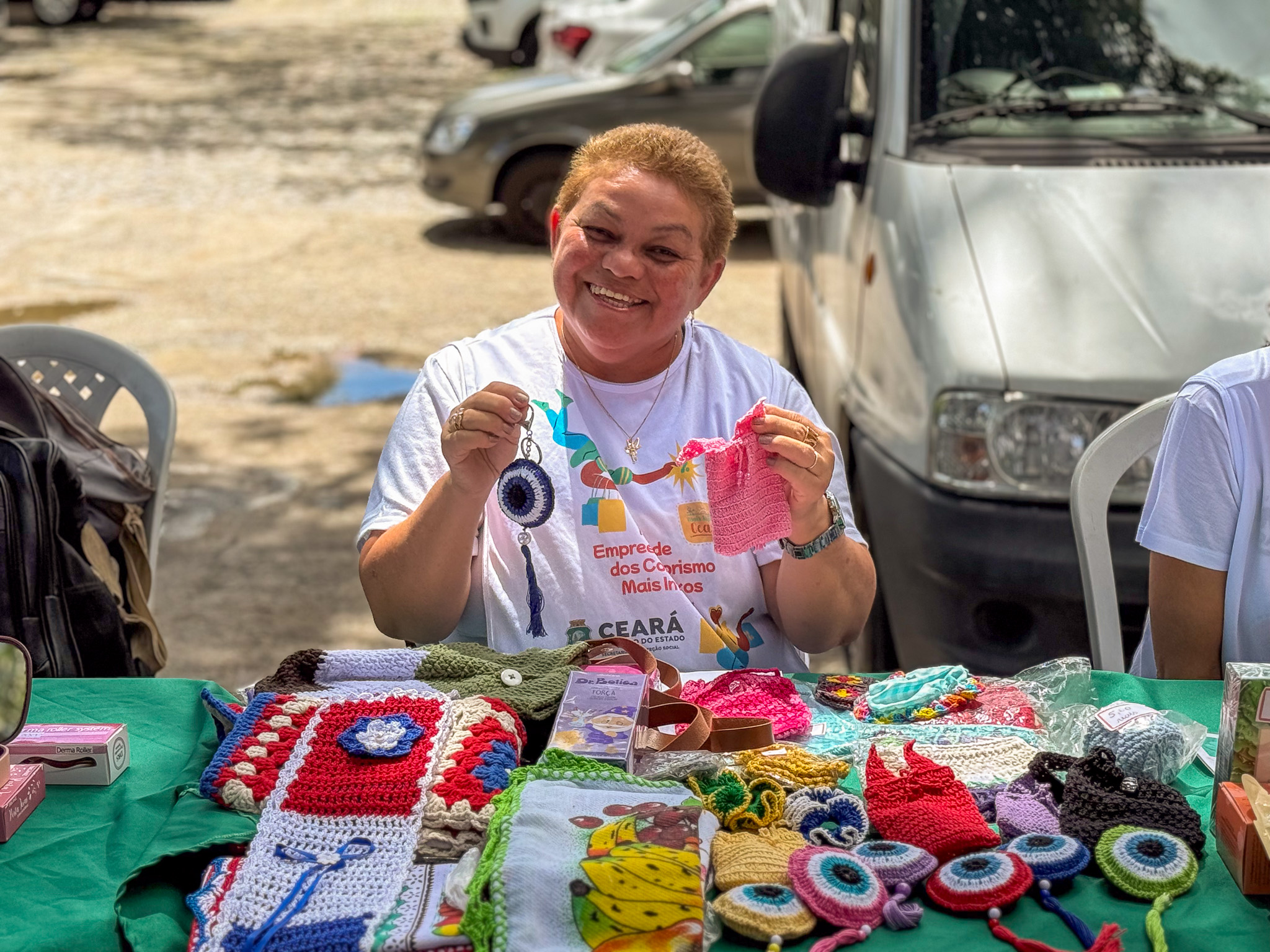 No espaço, Adélia se aperfeiçoou no crochê e passou a produzir diferentes peças artesanais. “Hoje eu faço capas para garrafas térmicas, bolsas e chaveiros de olho grego, que estão sendo muito procurados. O crochê me ajudou muito e hoje estou produzindo minhas próprias peças”, conta.
