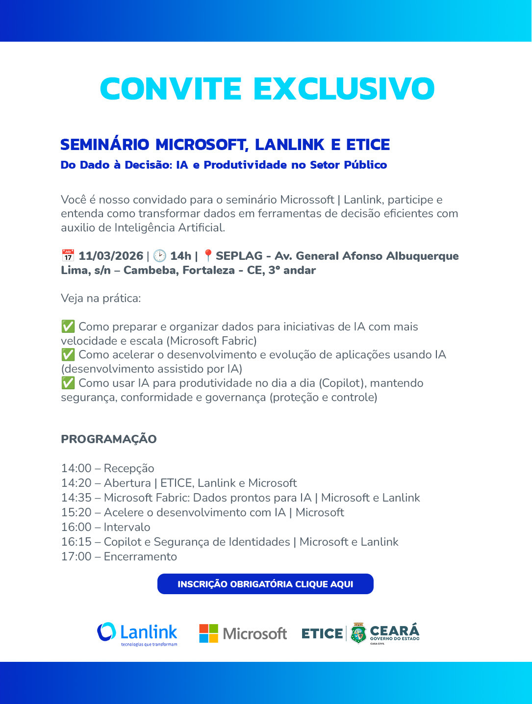 Na próxima quarta-feira (11), no auditório da Secretaria de Planejamento e Gestão do Estado (Av. General Afonso Albuquerque Lima, s/n – Cambeba, Fortaleza – CE, 3º andar), a partir das 14h, um seminário da Microsoft, por meio da Lanlink – sua representante no Brasil –, abordará o tema de Inteligência Artificial. O evento, organizado pela Empresa de Tecnologia da Informação do Ceará (Etice), é direcionado aos profissionais de Tecnologia da Informação dos órgãos do governo do Ceará.