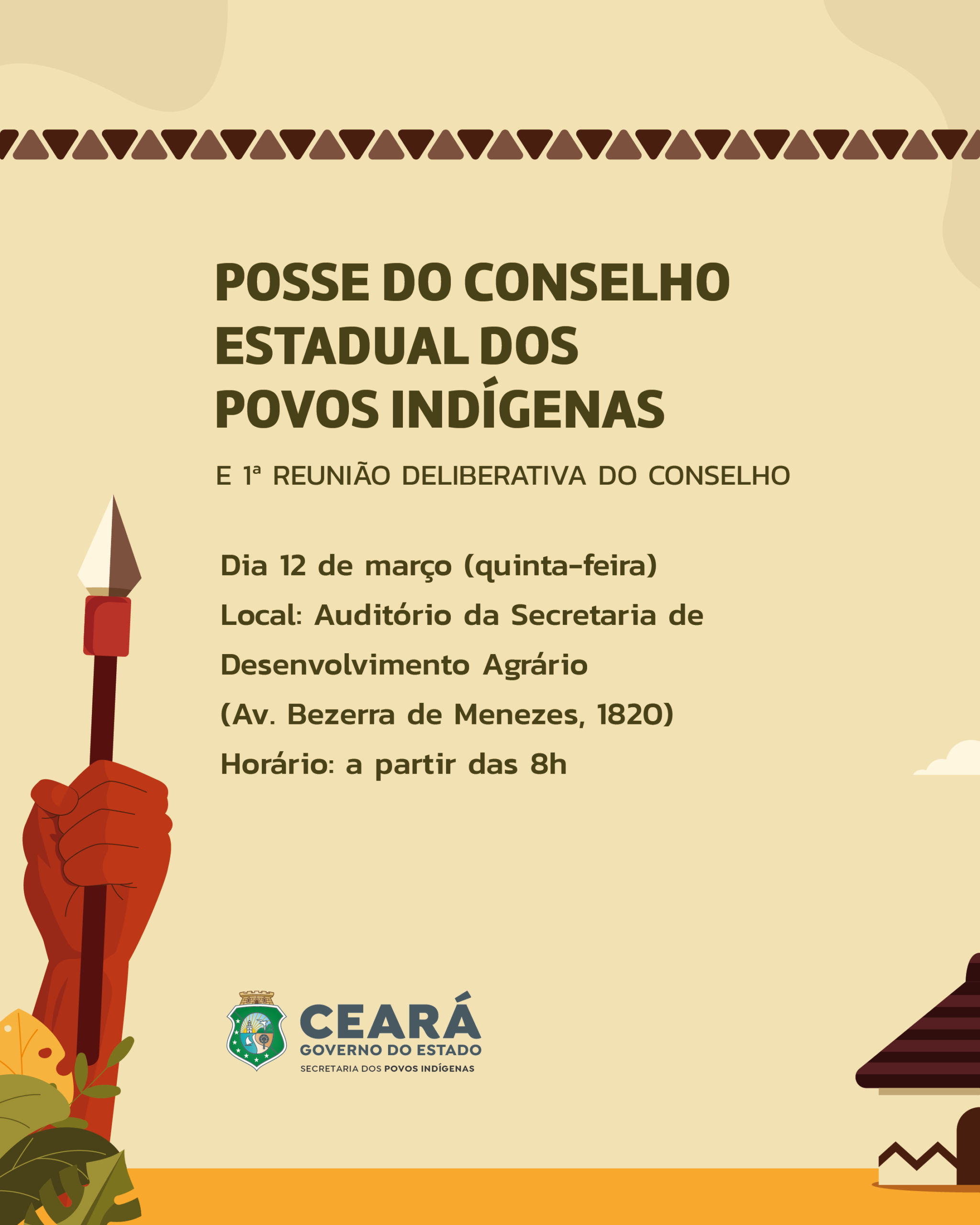 O Governo do Estado empossa nesta quinta-feira (12) os novos membros do Conselho Estadual dos Povos Indígenas do Ceará, em cerimônia promovida pela Secretaria dos Povos Indígenas (Sepince) no Auditório da Secretaria do Desenvolvimento Agrário (SDA), em Fortaleza.