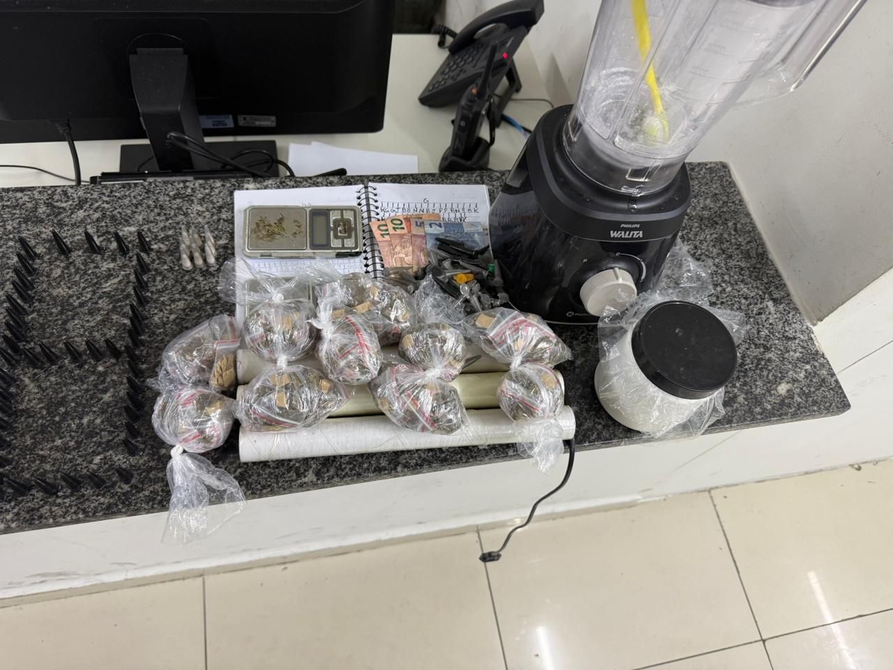 Na ocasião, os militares realizaram a abordagem e, no imóvel, apreenderam um total de 477 embalagens de entorpecentes prontos para serem comercializados – sendo 295 pacotes de maconha, de 110 pacotes de cocaína e 72 de haxixe -, além de dois pedaços maiores de maconha, com cerca de 410 gramas, um pote com 100 gramas cocaína, duas balanças, três rolos de papel filme, vários pinos plásticos, um caderno com anotações e dinheiro.
