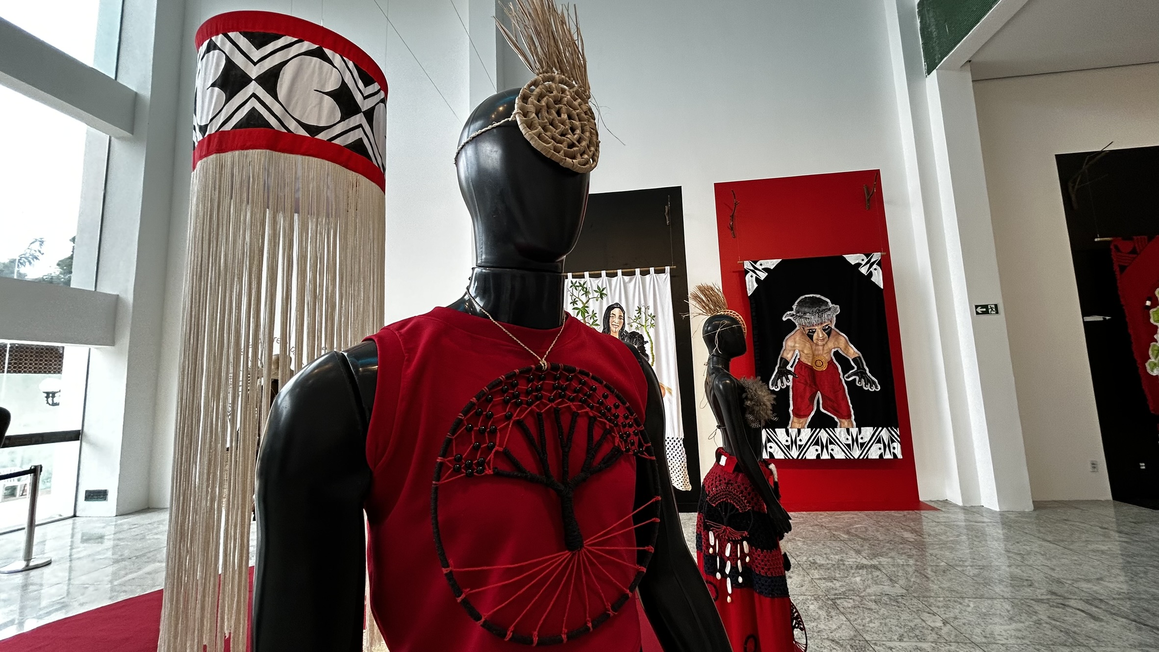 A exposição apresenta o mundo têxtil como linguagem artística e cultural, ligada ao corpo, ao território e à memória coletiva. Com um conjunto de obras que articulam moda, arte têxtil e instalação, a partir da vivência do Torém, uma dança ritual e dos grafismos do povo Tremembé. A exposição segue em cartaz até dia 21 de junho, no Teatro Carlos Câmara.
