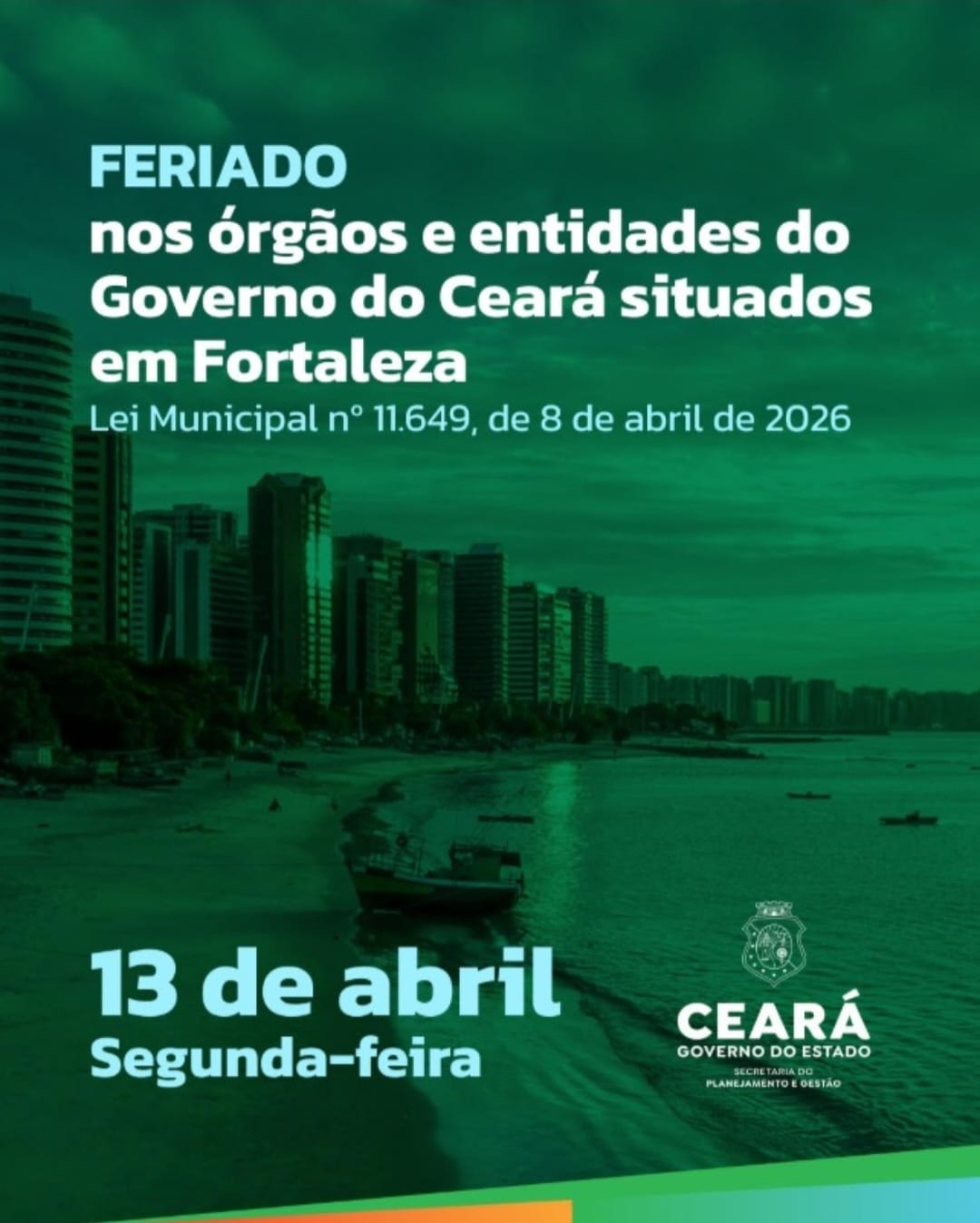 O Governo do Ceará, por meio da Secretaria do Planejamento e Gestão (Seplag-CE), informa que não haverá expediente nos órgãos e entidades estaduais localizados em Fortaleza na próxima segunda-feira, dia 13 de abril, aniversário da capital cearense, conforme a Lei nº 11.649, de 08 de abril de 2026.