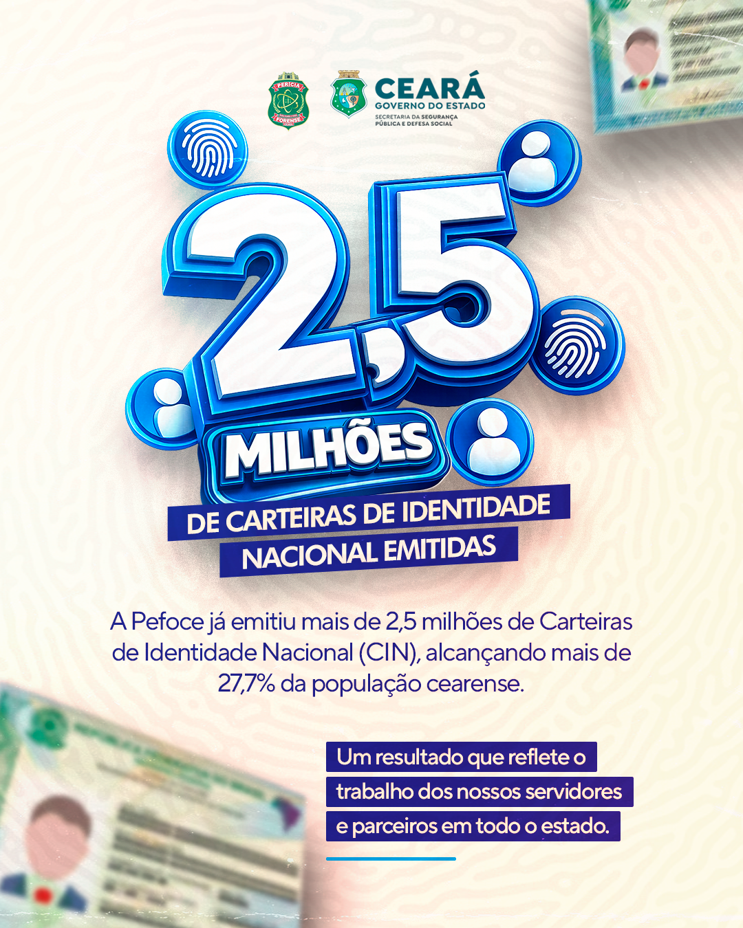 Para o coordenador de Identificação Humana e Perícia Biométrica (CIHPB/Pefoce), Ricardo Filgueiras, a instituição faz história com o resultado. “O número representa mais de 27% da população cearense com o novo documento, refletindo o investimento do Estado, da gestão da Pefoce, do esforço de servidores e colaboradores da CIHPB e dos parceiros que atuam nos atendimentos. A marca demonstra que estamos no caminho certo para atendermos a meta estabelecida pelo Governo Federal para que toda a população esteja com o novo documento”, pontuou.